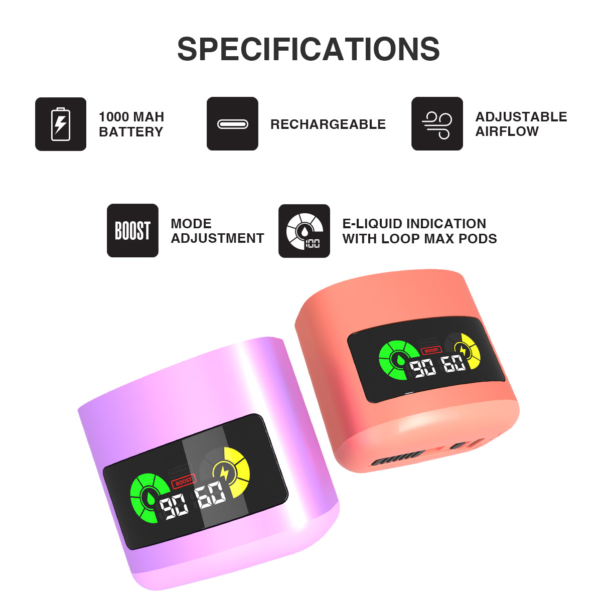 The LOOP MAX device offers two modes: Normal for a balanced experience and Boost for enhanced flavour and vapour. Easily switch between modes to suit your preferences. Powered by a 1000 mAh rechargeable battery, it ensures long-lasting use with each charge. With e-Liquid and battery indicators, you can effortlessly track your pod levels and power. The LOOP MAX Device also features an adjustable airflow setting which can be found at the bottom of the device.
