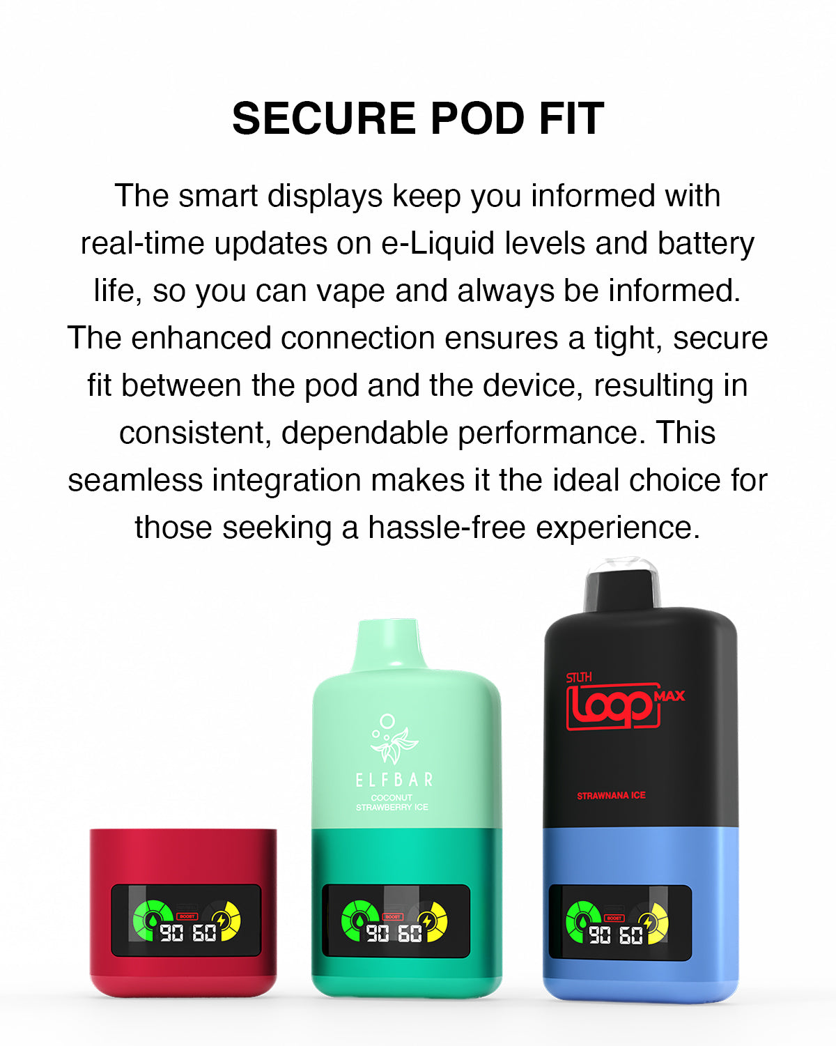 The sleek display offers a vibrant, easy-to-read screen, putting all your essential information right at your fingertips. Compact yet powerful, the LOOP MAX is seamlessly compatible with all LOOP MAX Pods, designed for convenience, performance, and reliability, making it the ideal device.
